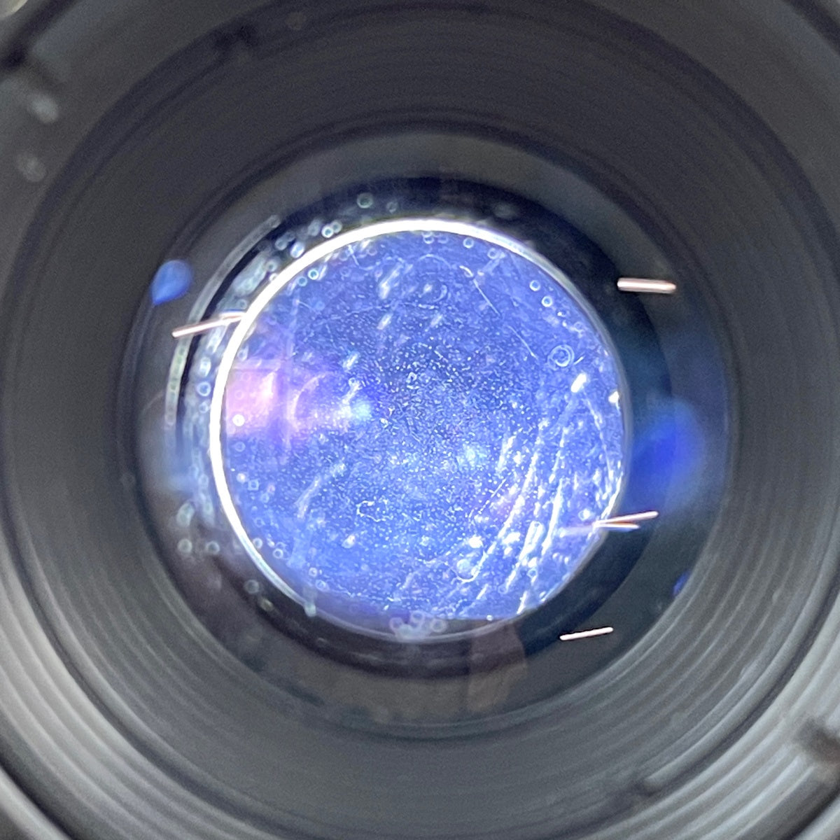 レンズ内部にクモリやカビ、キズ、ホコリの混入、コバ落ち、前後の表面寄りにキズがあります。